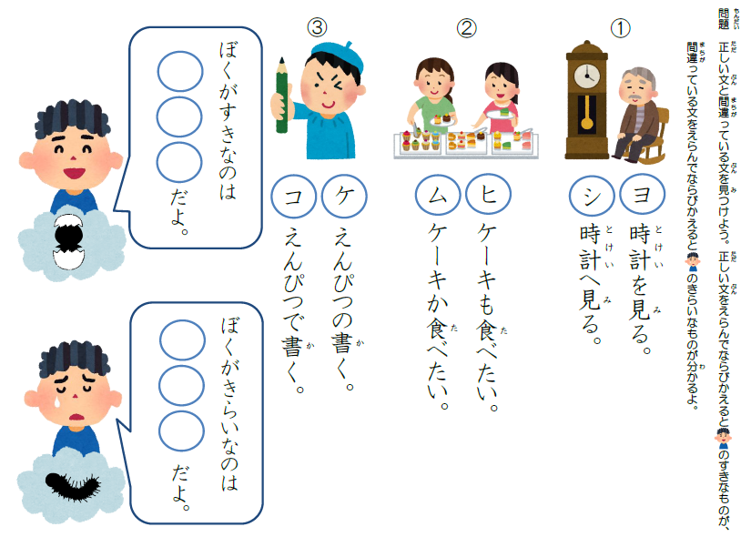 絵を見てそれぞれの助詞を使って文章を完成させる練習(の、を、に) |
